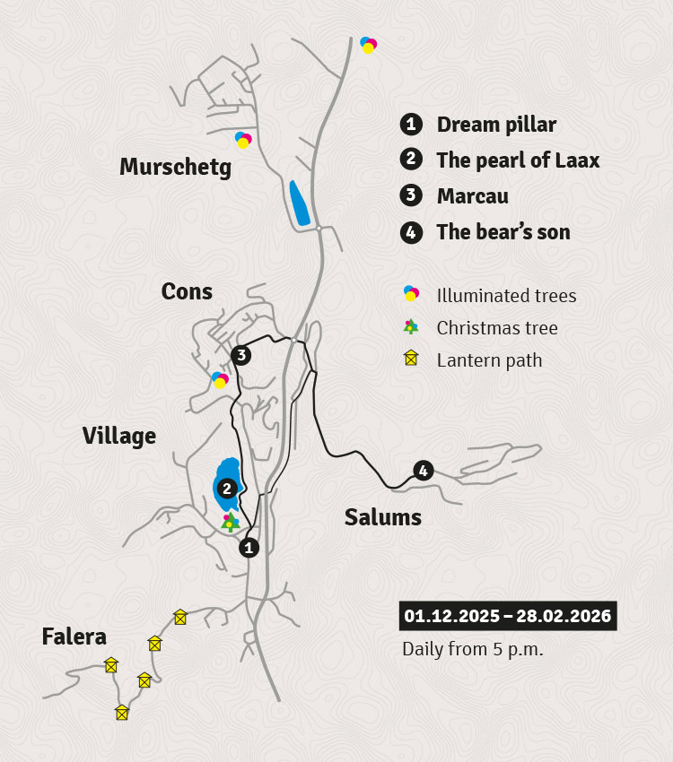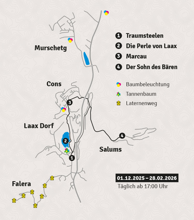 Verschiedene Lichtskulpturen ziehen sich durch die Dorfteile der Gemeinde. Jedem Kunstwerk liegt eine Laaxer Geschichte zugrunde, welche am jeweiligen Ursprungsort inszeniert wird.