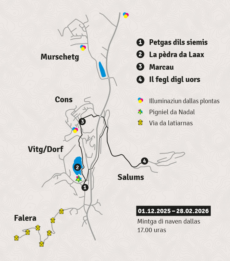 Sper las installaziuns da glisch sclareschan en quater loghens pégns, viazza e caglias en colurs mischedadas e transforman la cuntrada en in spitachel magic.